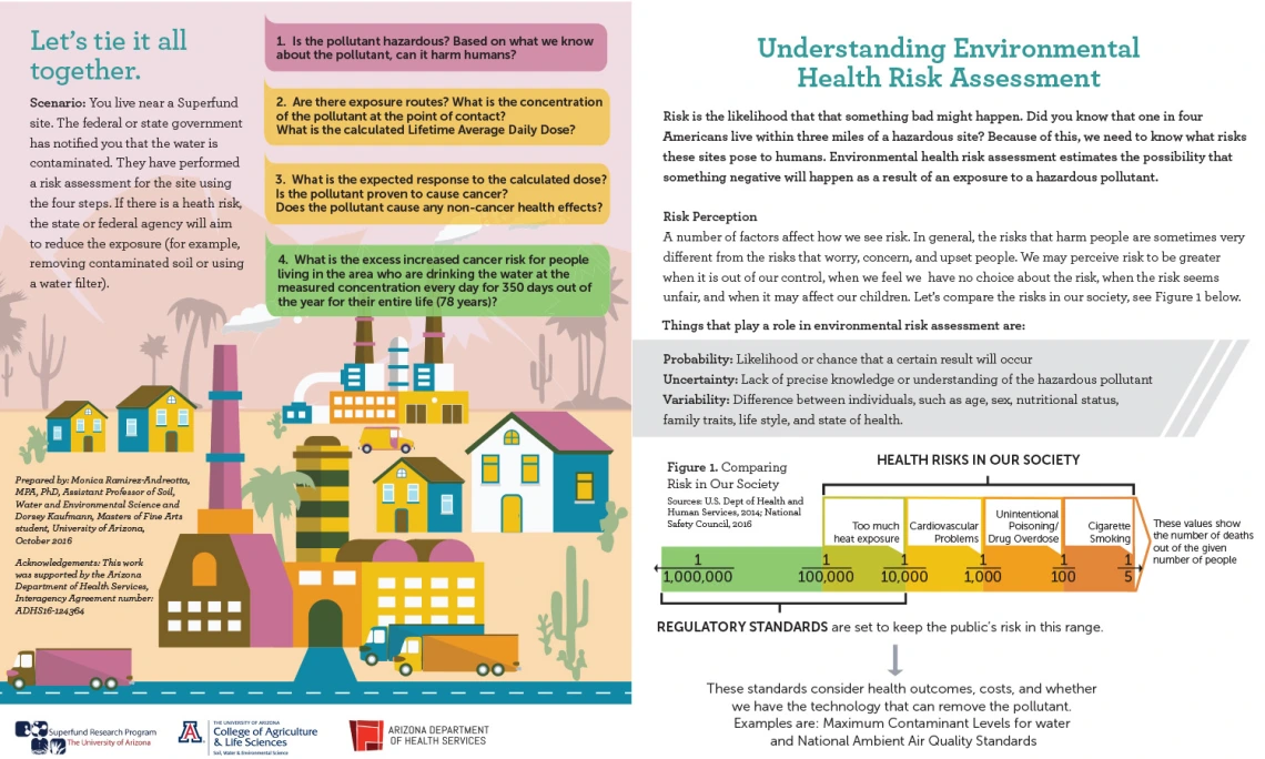 The UA SRP Research Translation Core (RTC) received a grant in 2016 from the Arizona Department of Health Services (ADHS) to develop a community information sheet that describes the environmental health risk assessment process for environmental contaminants. ADHS approached the UA SRP because of their experience in developing environmental health educational materials. The new information sheet is designed for individuals living near Superfund sites and is entitled, “Understanding Environmental Health Risk Assessment”.